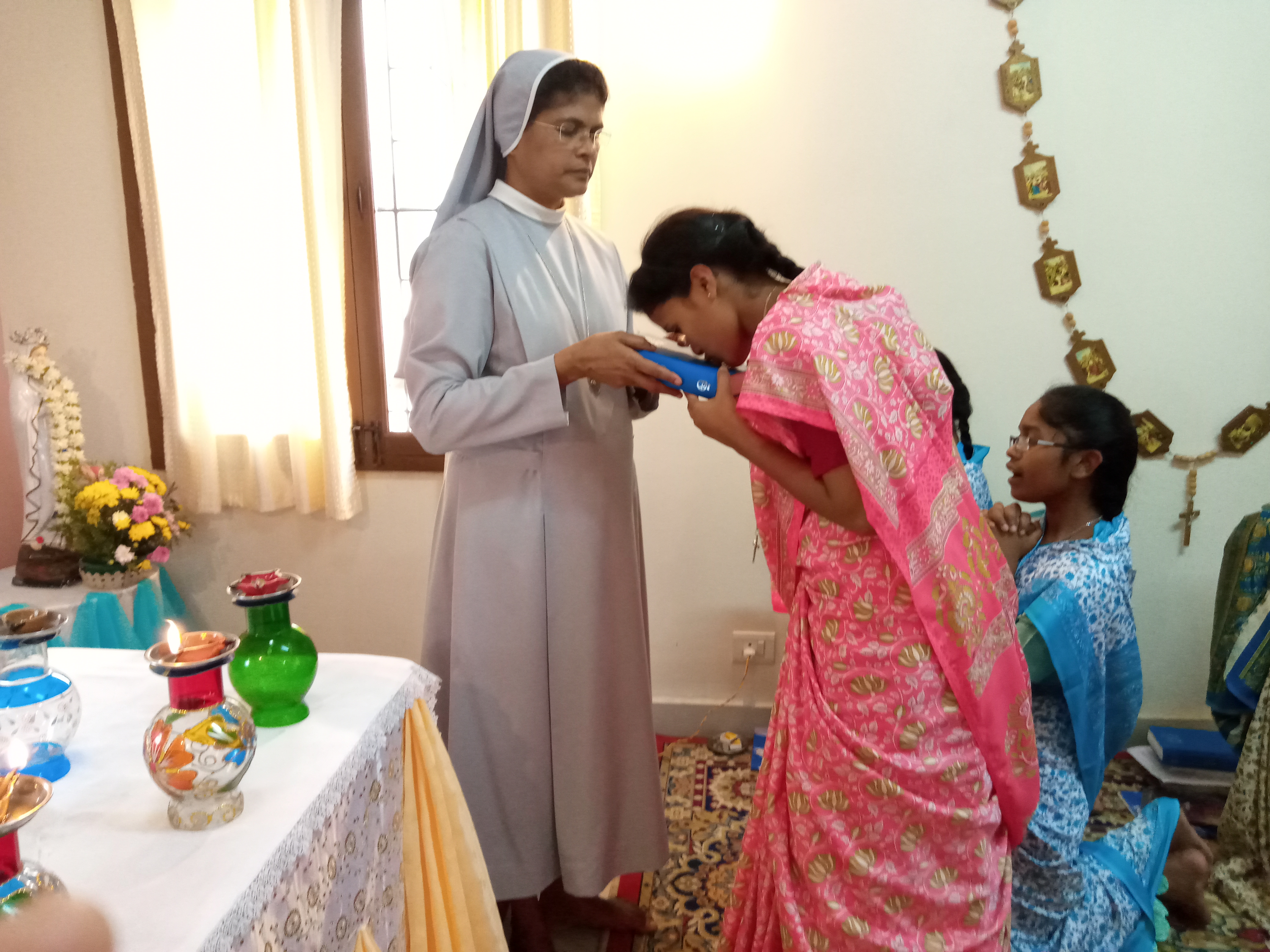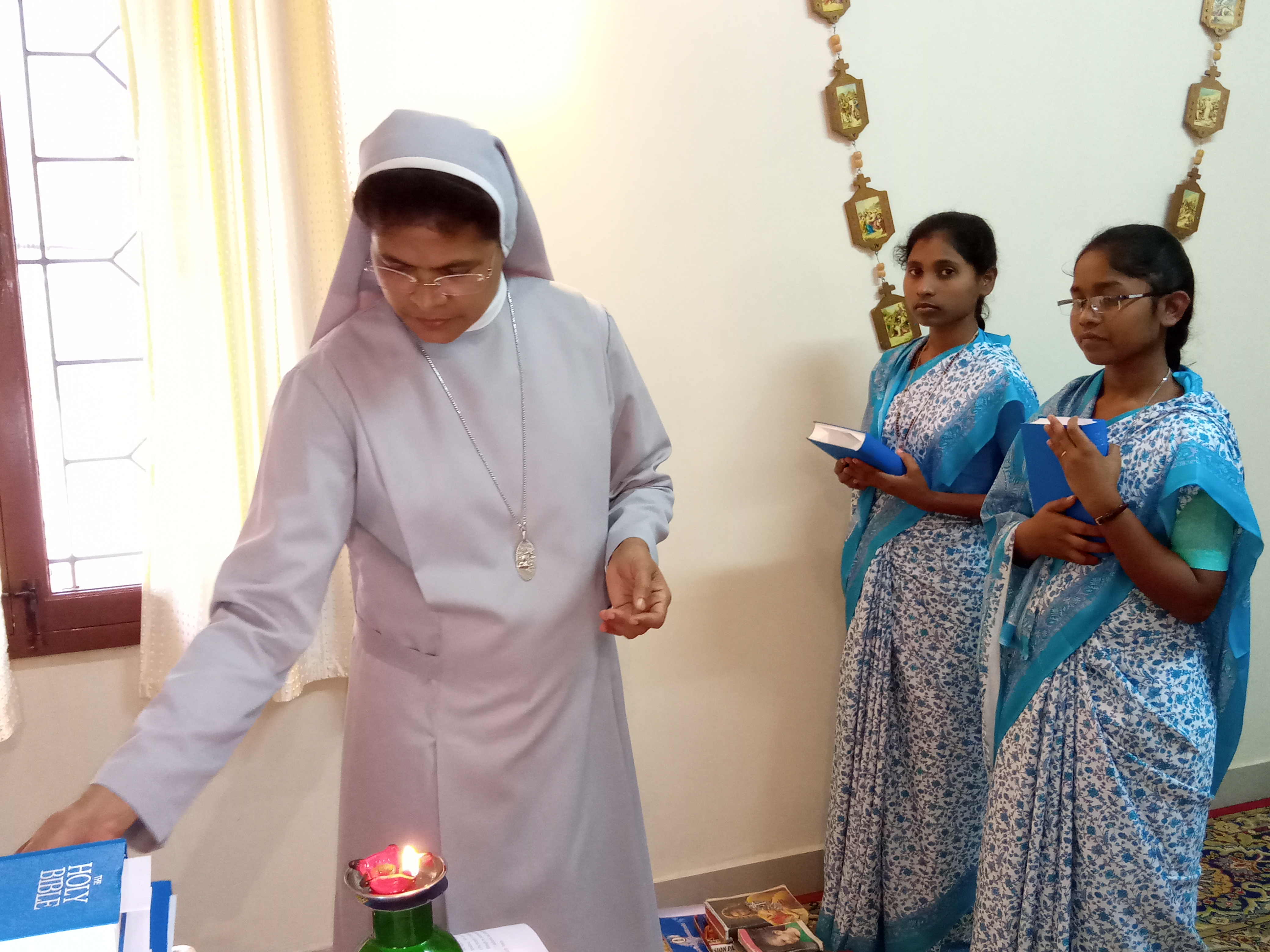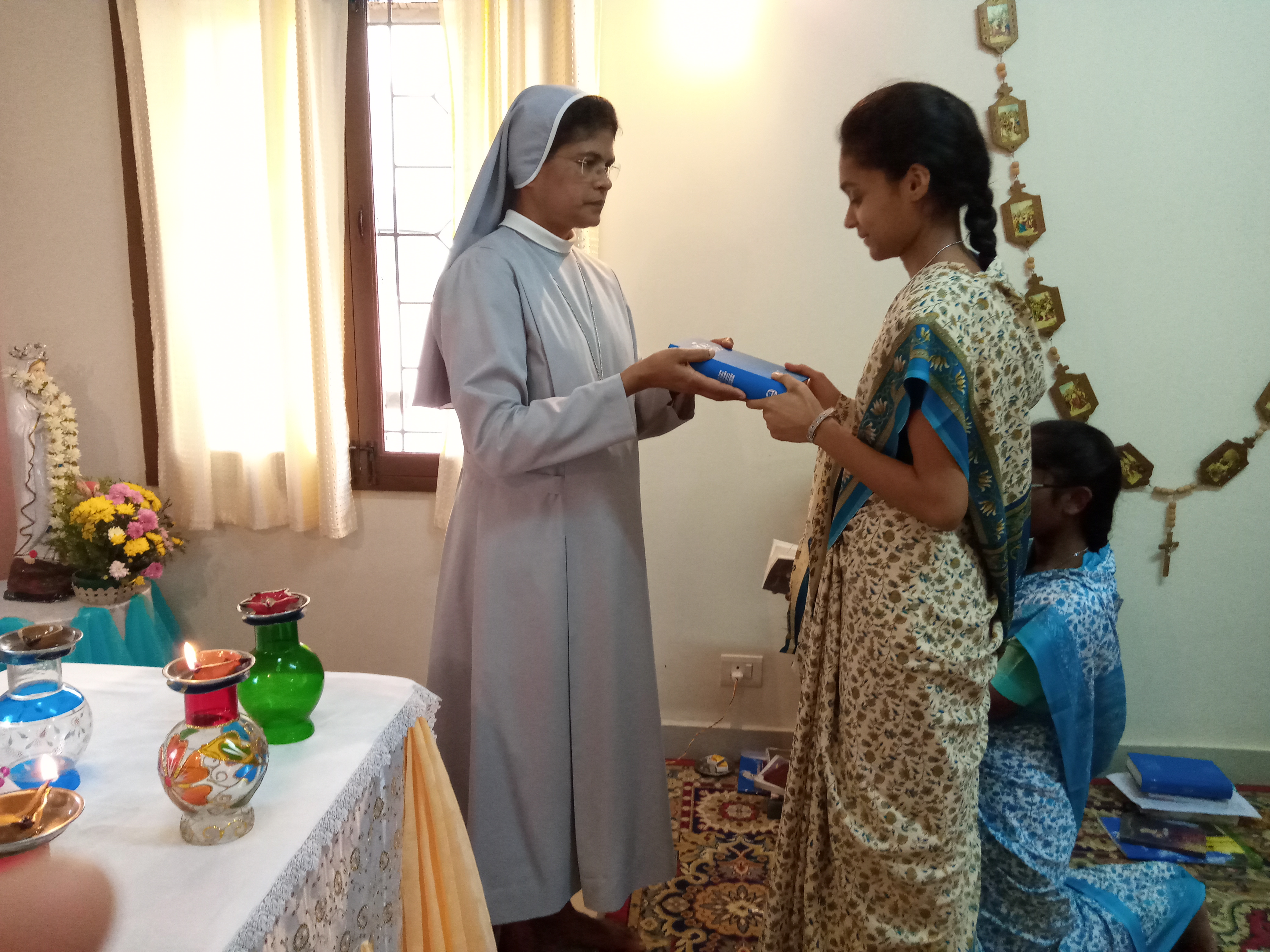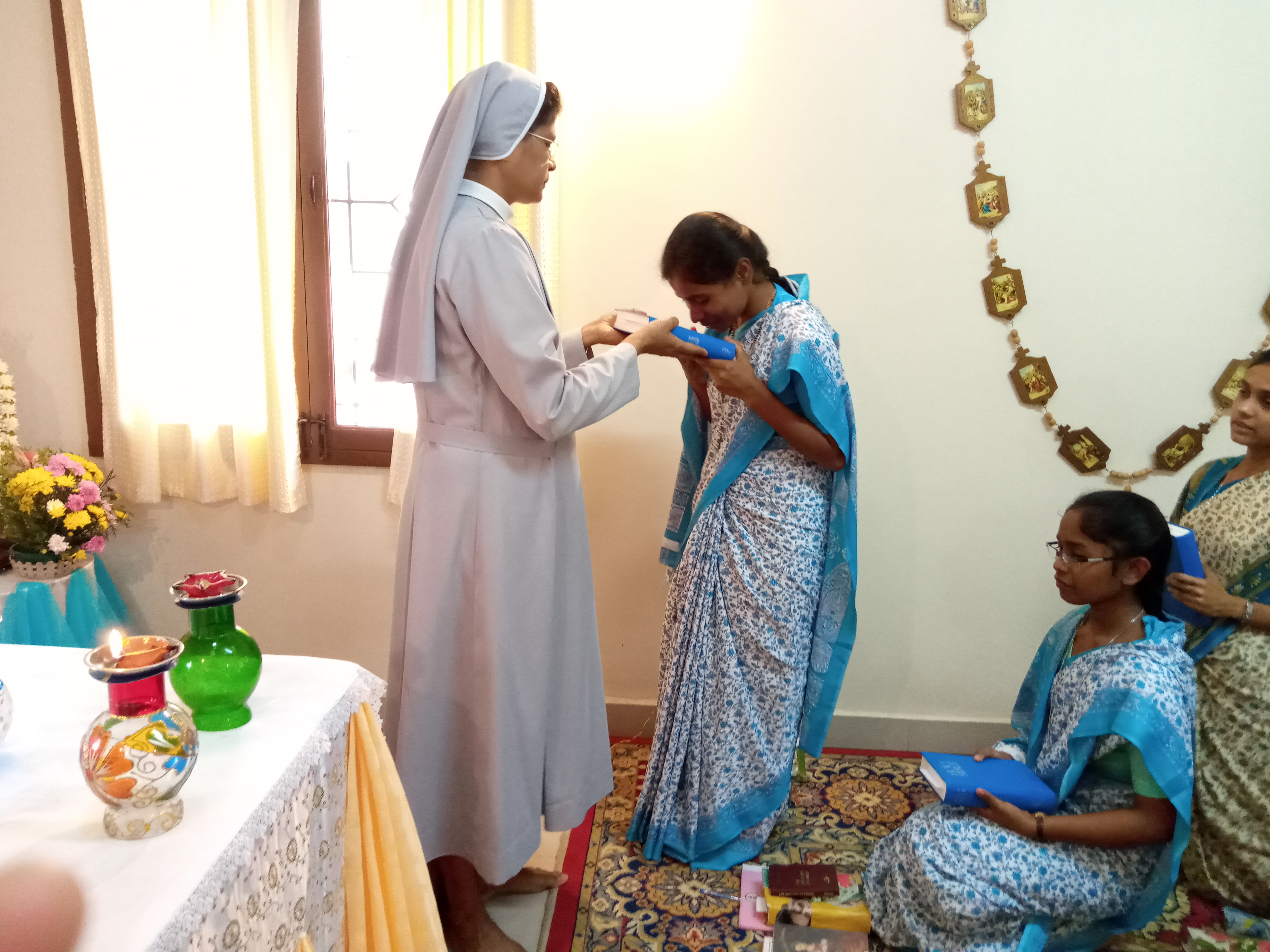 We gathered in Maninivas community chapel at 3,pm. for the special prayer service. The Regional superiour handed over to them the Bible and the book of Imitation of Christ as a sign of their entry into postulany. They were given also a medal with the image of Mother of Divine Providence.