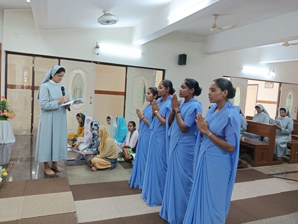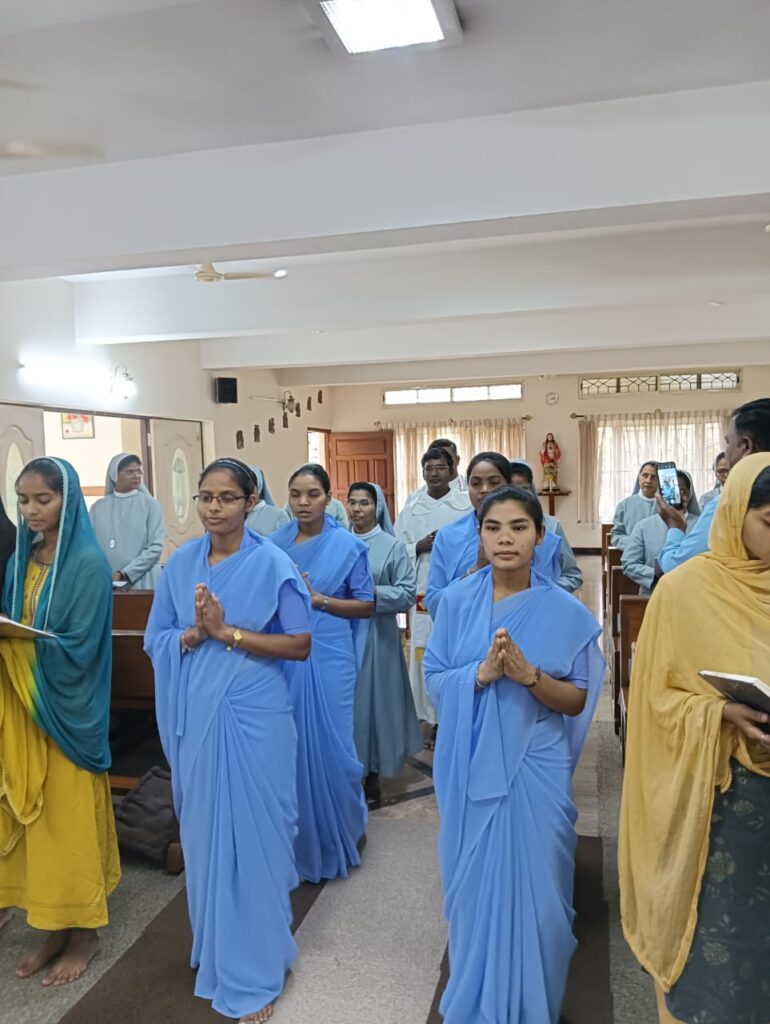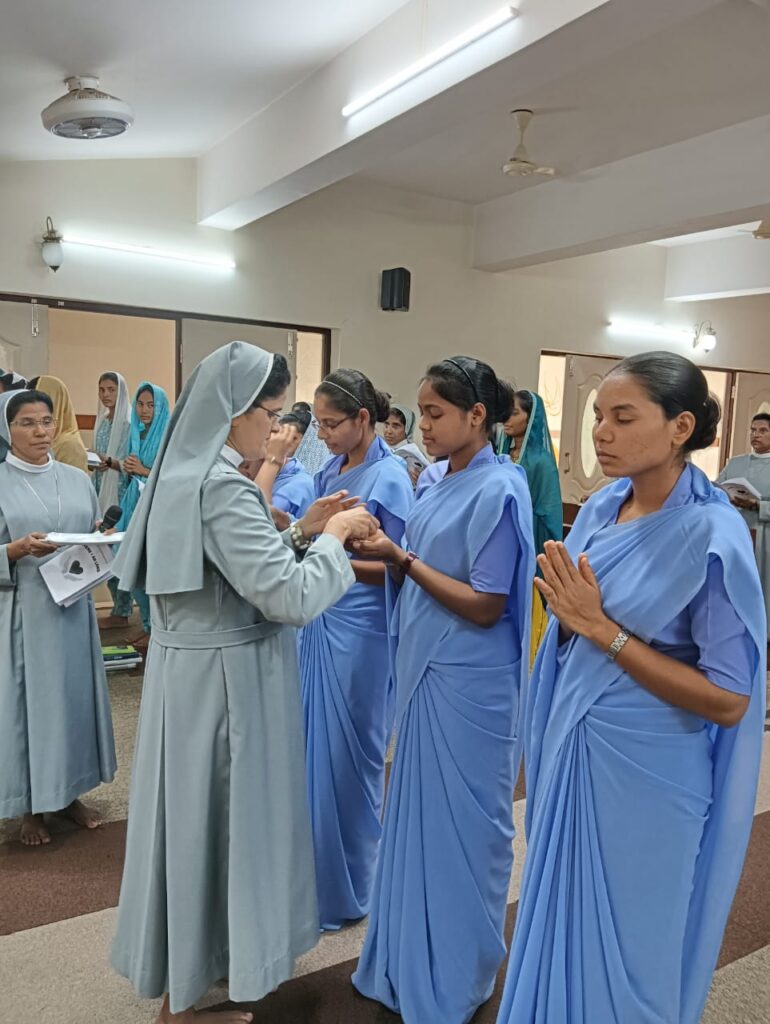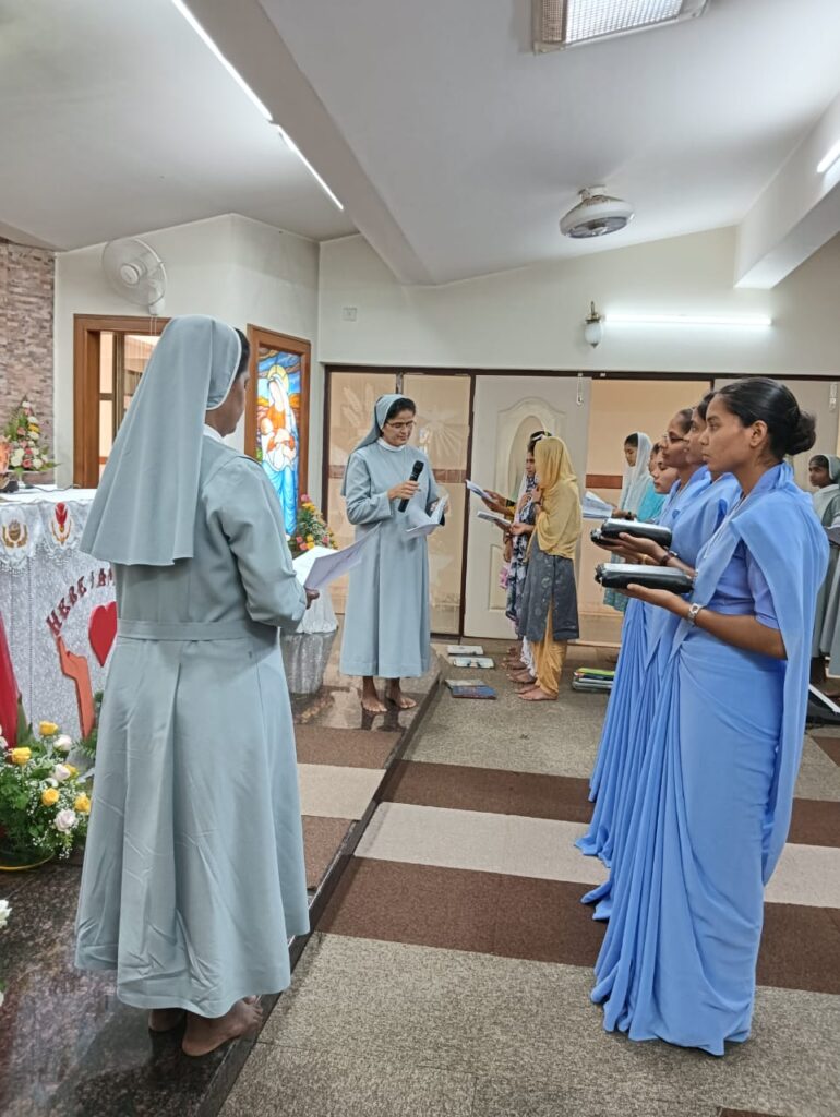 After the liturgy of the word, the celebrant gave an inspiring homily on the `call of Samuel “Here I am Lord”. The postulants were then given the cross and the office prayer book by the regional superior as a sign of initiation to the religious life and belongingness to the institute. The regional superior then entrusted them to the novice mistress Sr. Jaisamma Kappil.