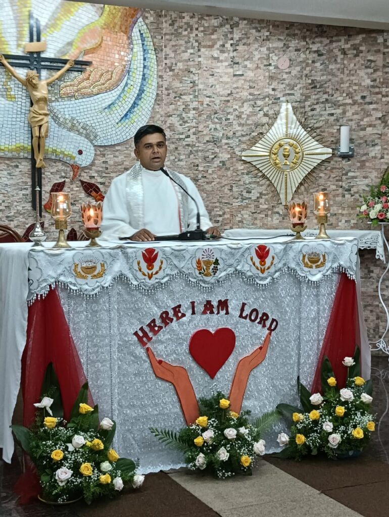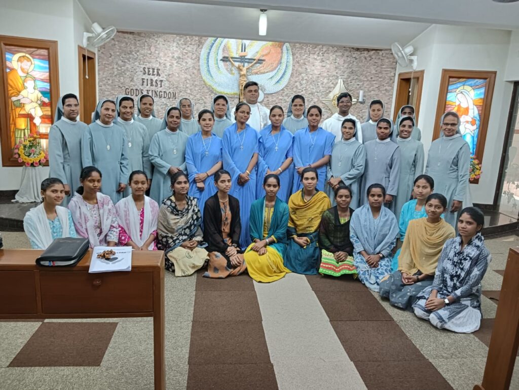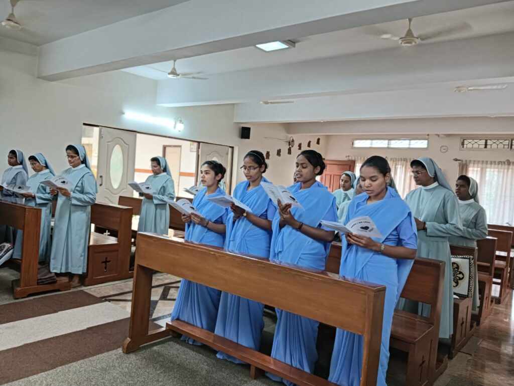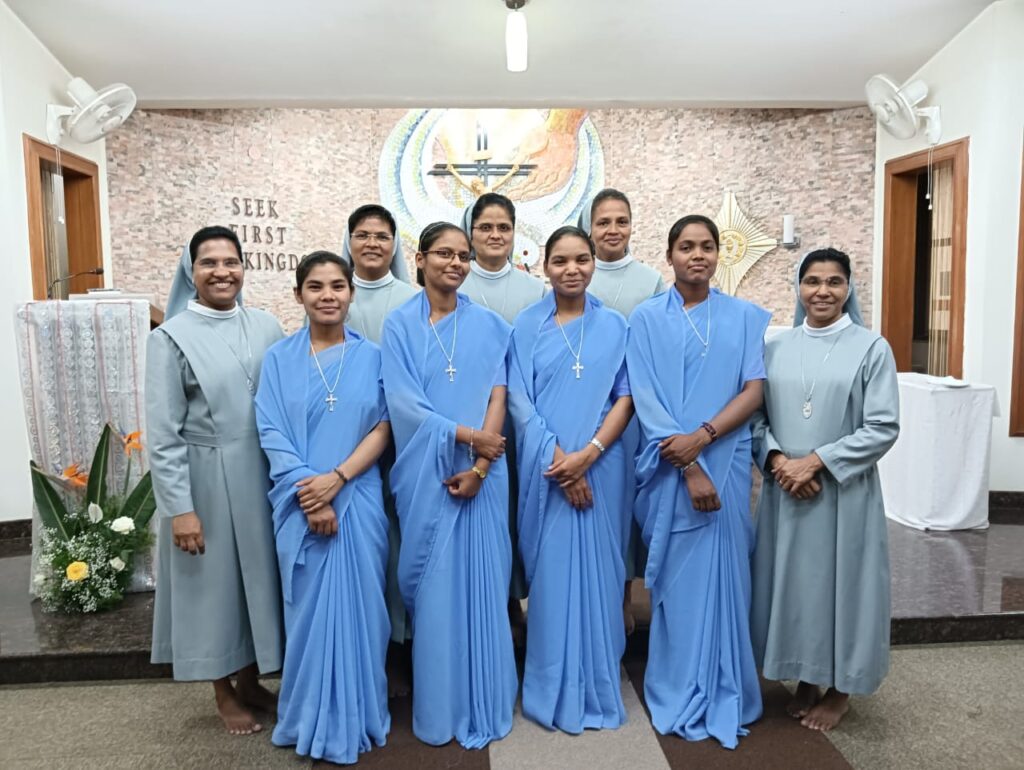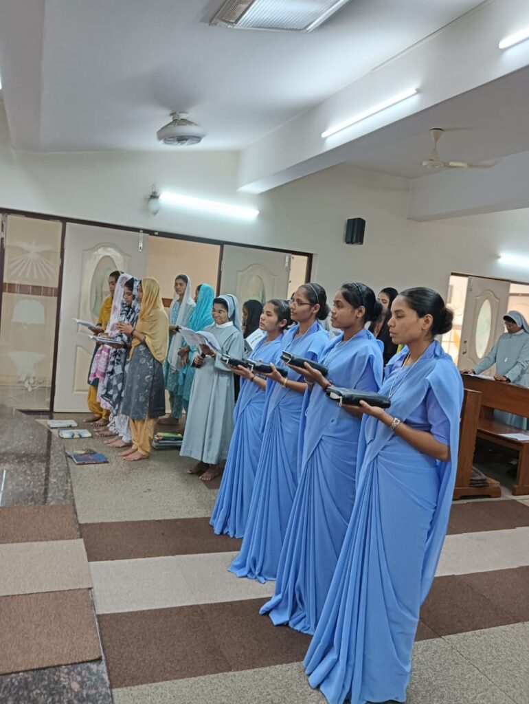After the liturgy of the word, the celebrant gave an inspiring homily on the `call of Samuel “Here I am Lord”. The postulants were then given the cross and the office prayer book by the regional superior as a sign of initiation to the religious life and belongingness to the institute. The regional superior then entrusted them to the novice mistress Sr. Jaisamma Kappil.